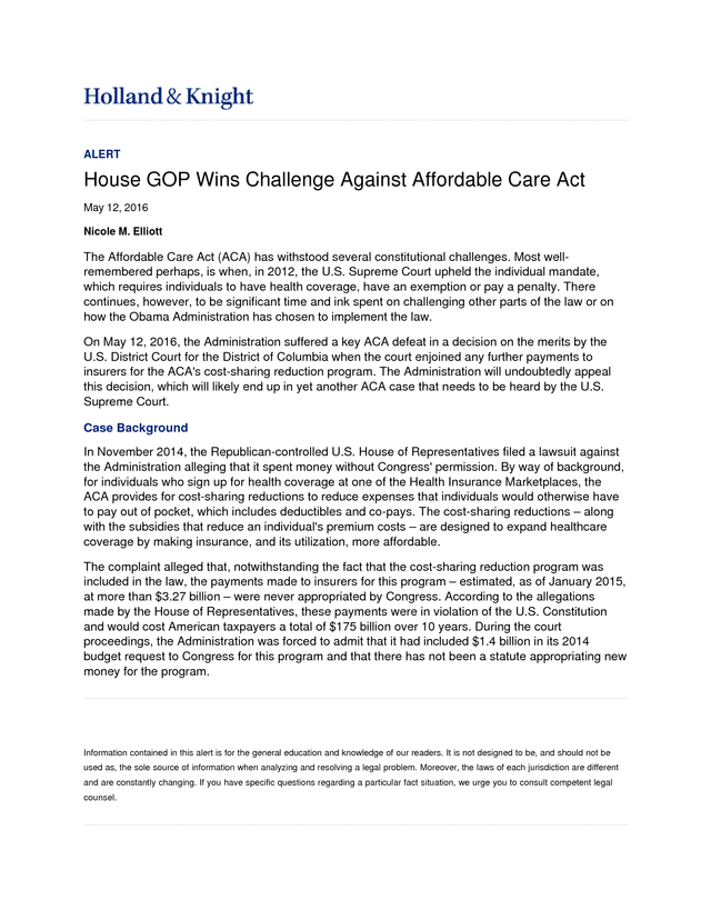 On May 12, 2016, the Administration suffered a key ACA defeat in a decision on the merits by the