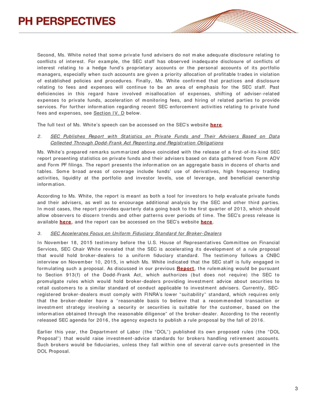 The SEC’s press release is available here, and the report can be accessed on the SEC’s website here. 3. SEC Accelerates Focus on Uniform Fiduciary Standard for Broker-Dealers In November 18, 2015 testimony before the U.S. House of Representatives Committee on Financial Services, SEC Chair White revealed that the SEC is accelerating its development of a rule proposal that would hold broker-dealers to a uniform fiduciary standard. The testimony follows a CNBC interview on November 10, 2015, in which Ms.