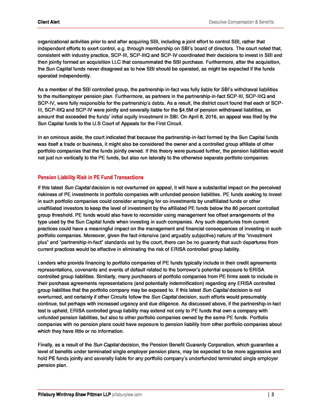 Pillsbury Client Alert, PE Fund Deemed a 'Trade or Business'—May Be Liable for Portfolio Companies' Pensions, (August 2013),